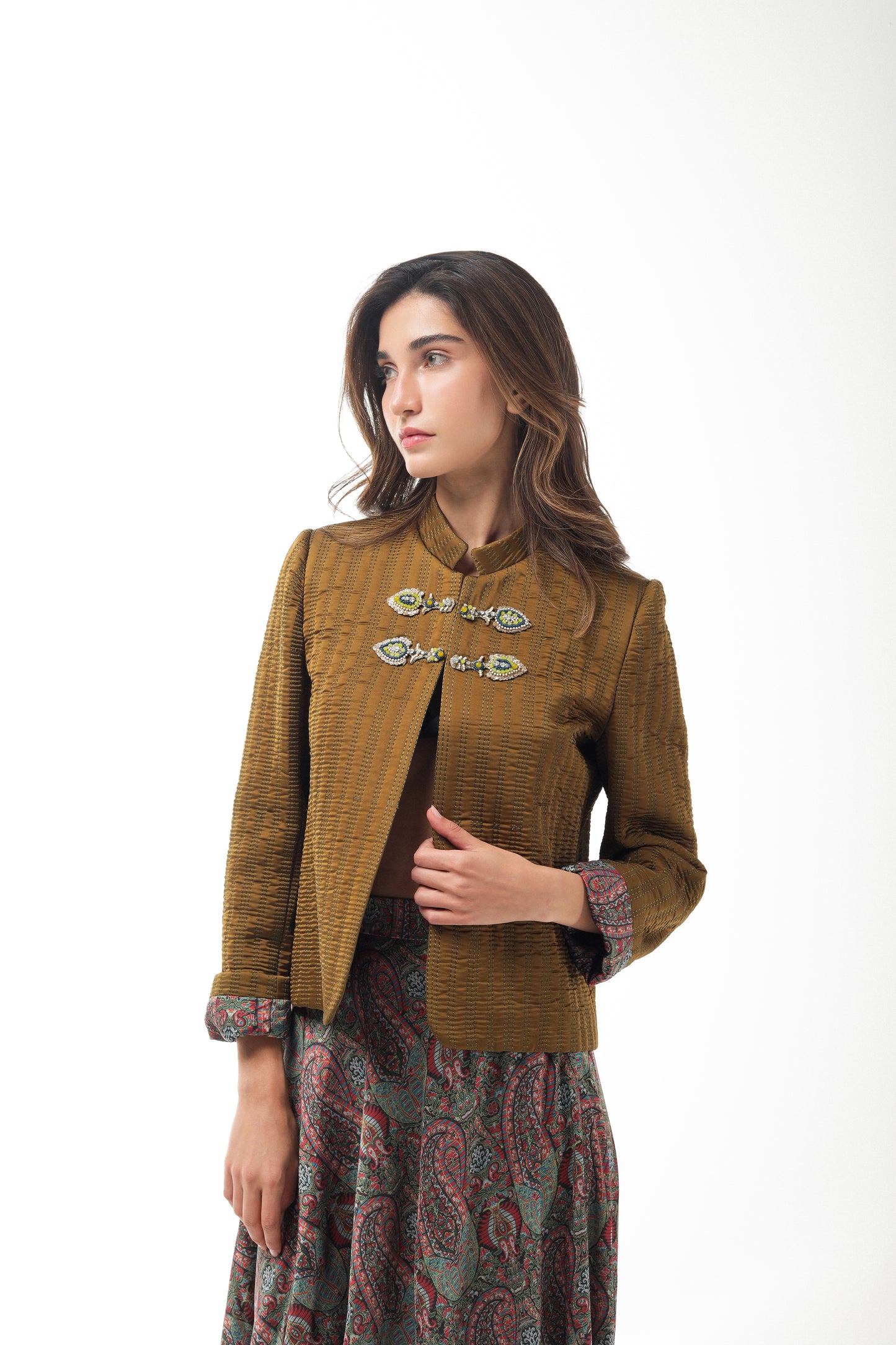 Persian motifs are reinterpreted into contemporary silhouettes with quiet grandeur. Rich fabrics and sculptural cuts evoke the graceful intimacy of a winter court, deeply rooted in legacy