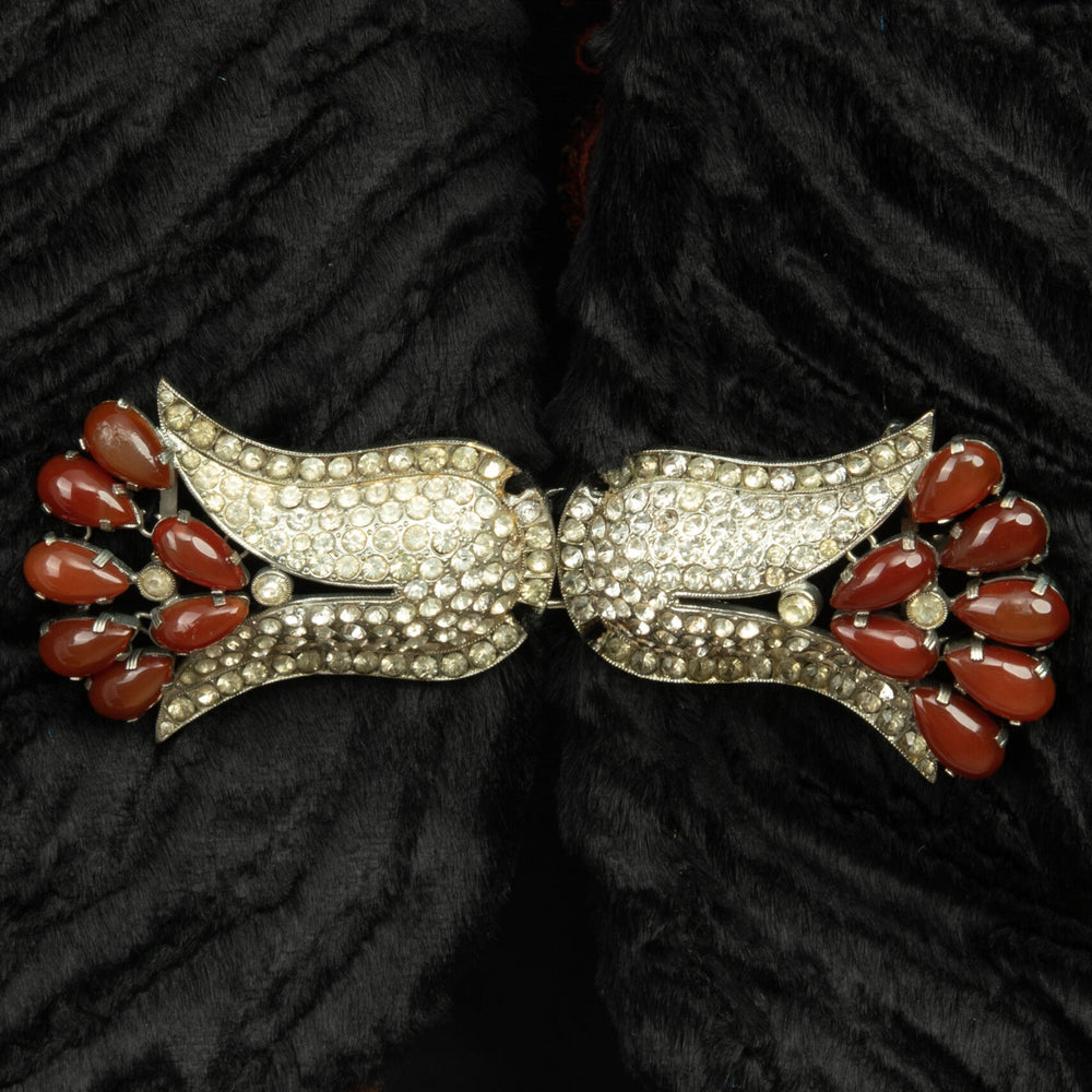 This faux karagul vest is embellished by this exquisite precious hook, adorned with agate and faux diamonds. The lining is pure silk designed by our group of fabric designers. Material: Faux karagul (velvet) Silk Steel hooks, agate, faux diamonds.