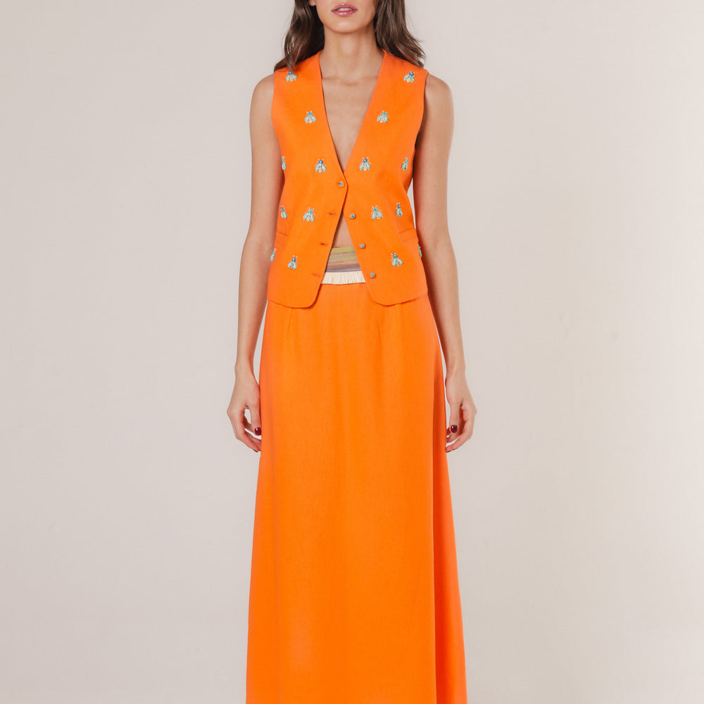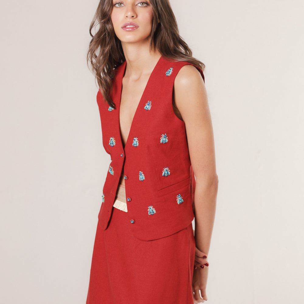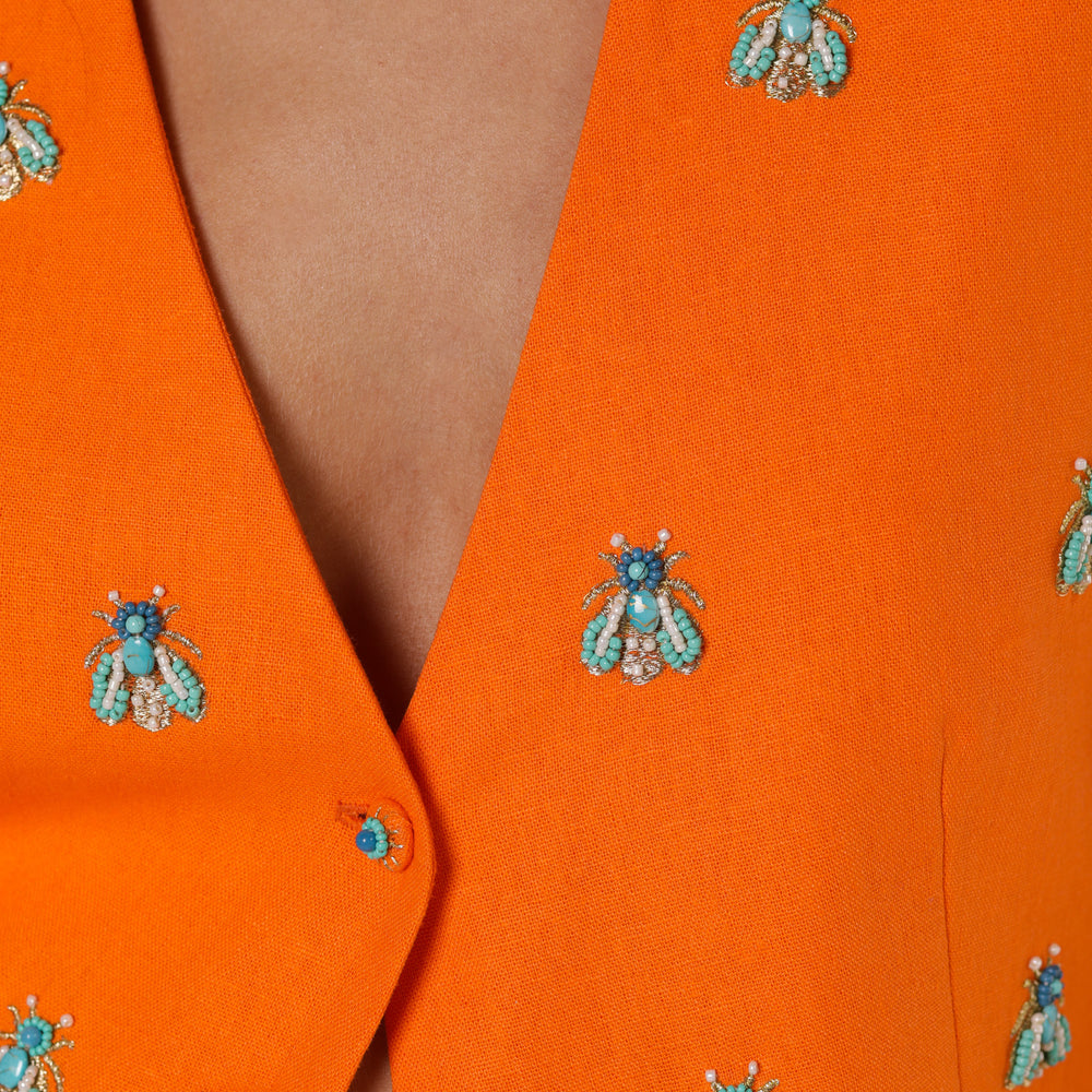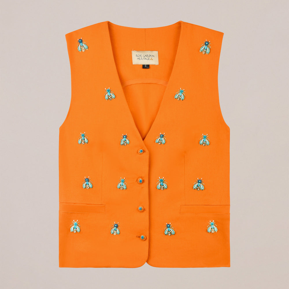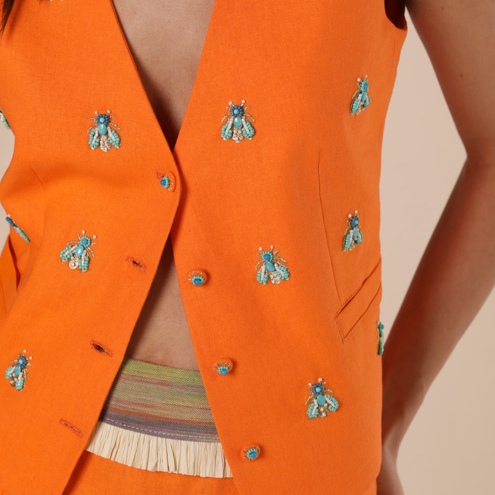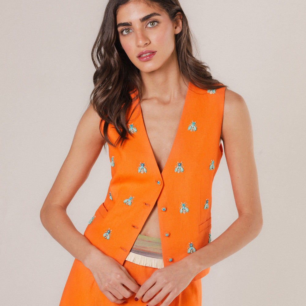 The Bee Vest features a sculptural deep V-neckline that elegantly frames the collarbone, bringing effortless sophistication to the silhouette. Sleeveless and structured, it allows for graceful ease, while the embroidered bees, brought to life with delicate turquoise beadwork and Swarovski crystals, add a whimsical, tactile richness — like tiny treasures in flight.