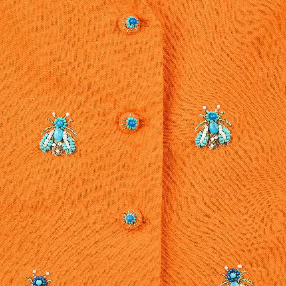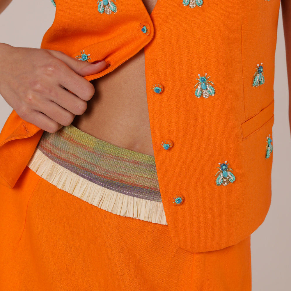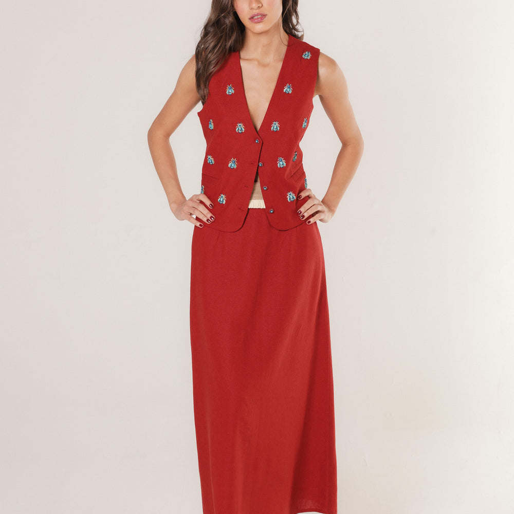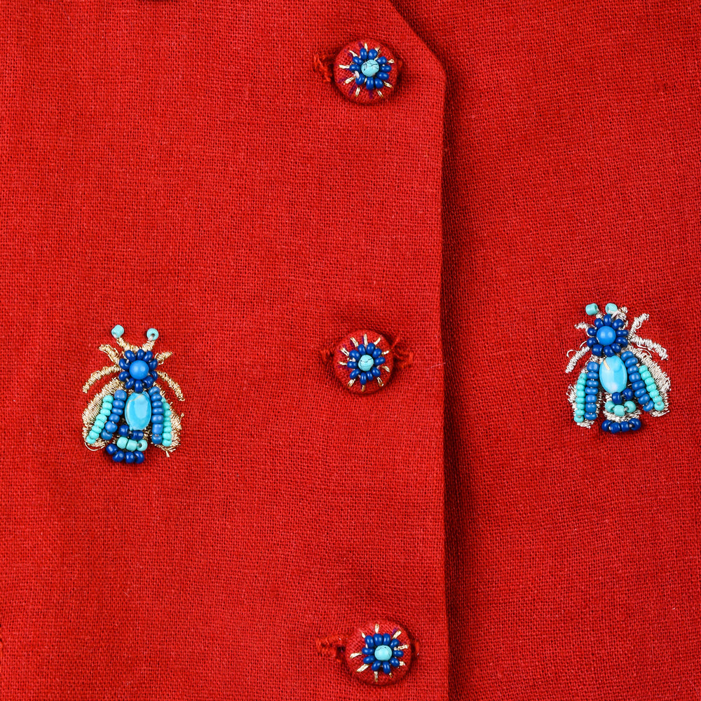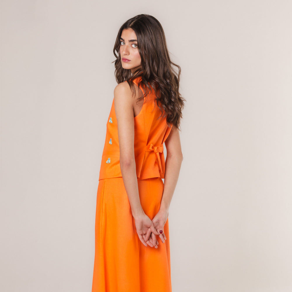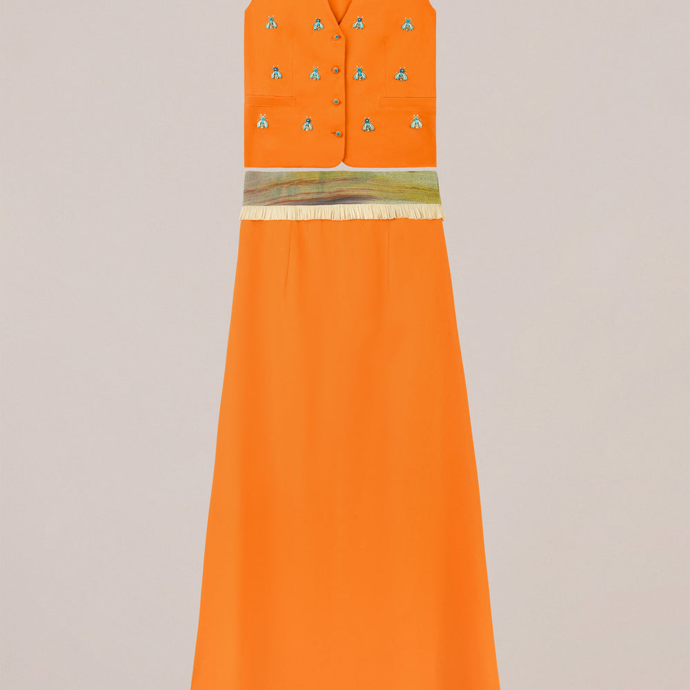 The Bee Vest features a sculptural deep V-neckline that elegantly frames the collarbone, bringing effortless sophistication to the silhouette. Sleeveless and structured, it allows for graceful ease, while the embroidered bees, brought to life with delicate turquoise beadwork and Swarovski crystals, add a whimsical, tactile richness — like tiny treasures in flight.