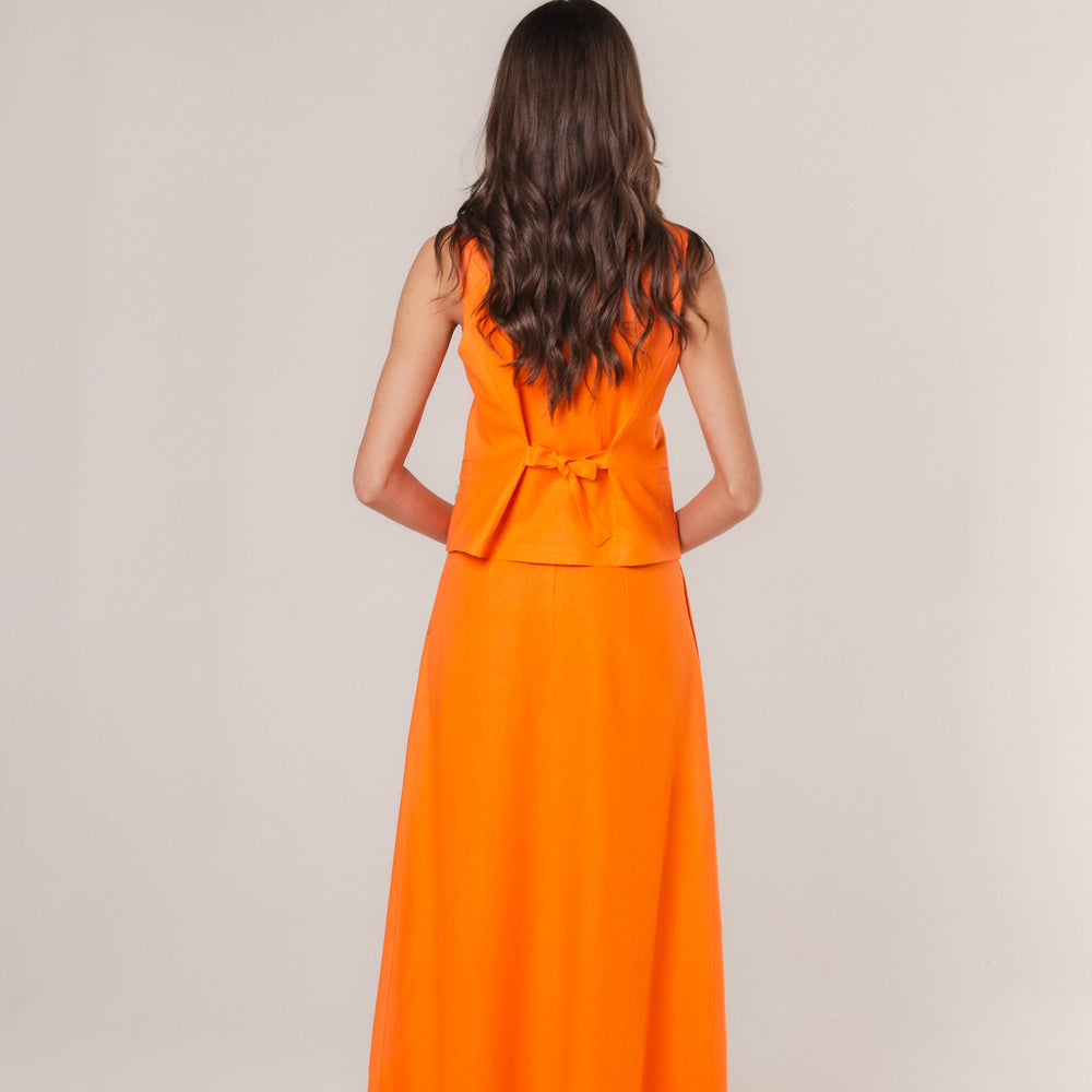 The matching skirt unveils a fluid A-line shape that gently skims the body, flattering and easy to wear. Its high waist is adorned with a ruffled raffia detail, evoking organic textures and echoing the natural world that inspires the design. Falling to the ankles, it carries an air of bohemian elegance, perfect for seaside strolls or sun-drenched city days.