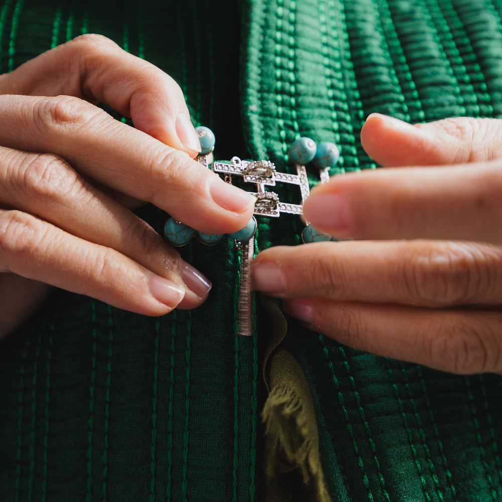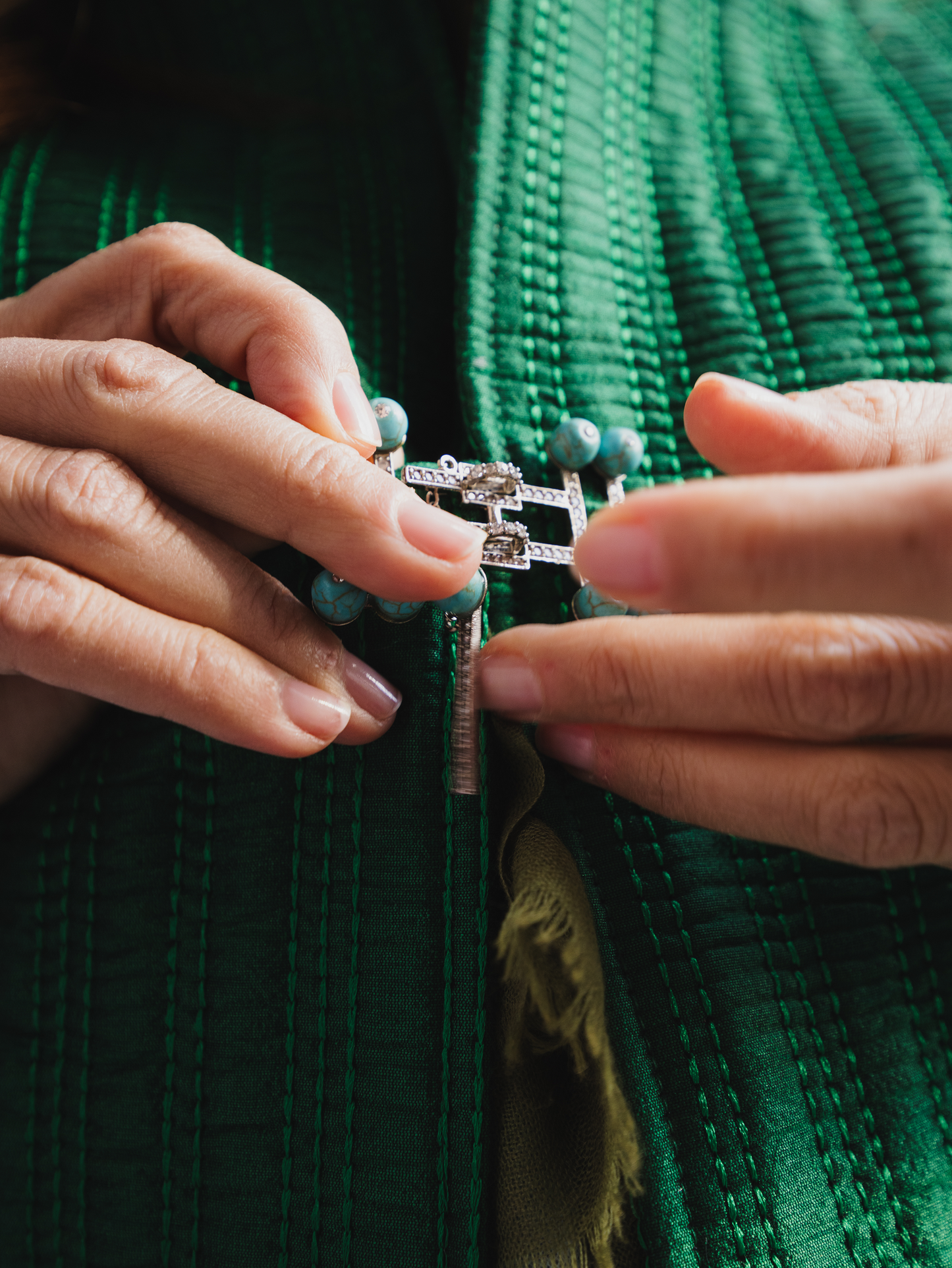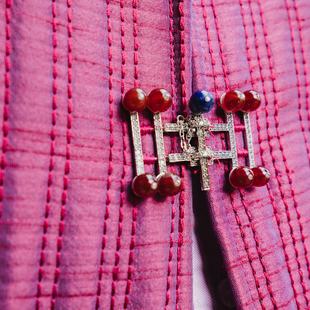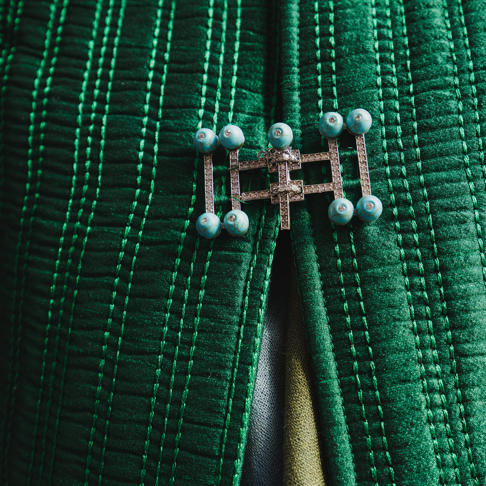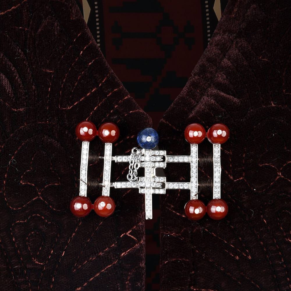 Experience the epitome of luxury and craftsmanship with our exquisite velvet Gabbeh gilet inspired from the 1920’s era. The gilet features semi-precious hooks, meticulously fashioned by skilled jewel artisans. The inside of the gilet features light weight silk with geometric designs. It pairs perfectly with other pieces from the collection. Its button is exquisite and jeweled. This clip is taken from an old antique clip that was made by our artisan jeweler and is studded with semi-precious lapis lazuli and agate stones.