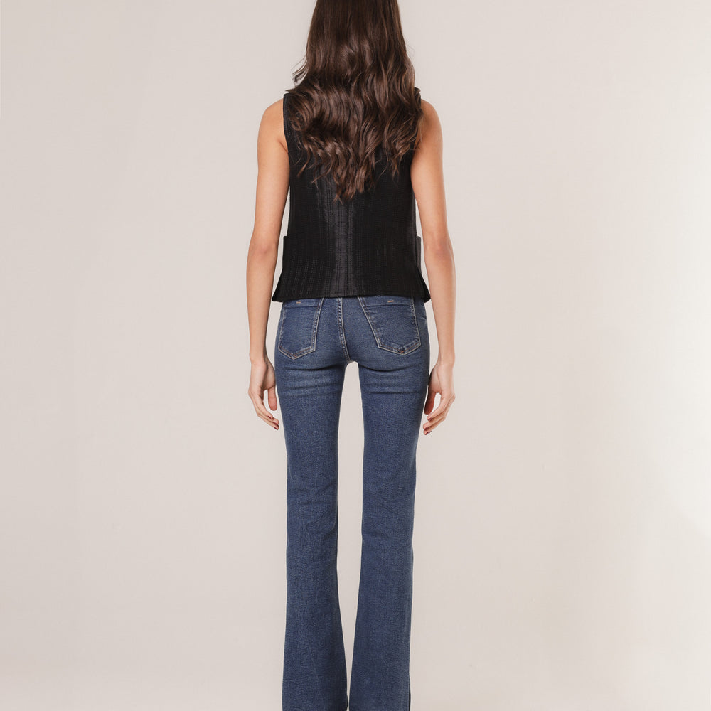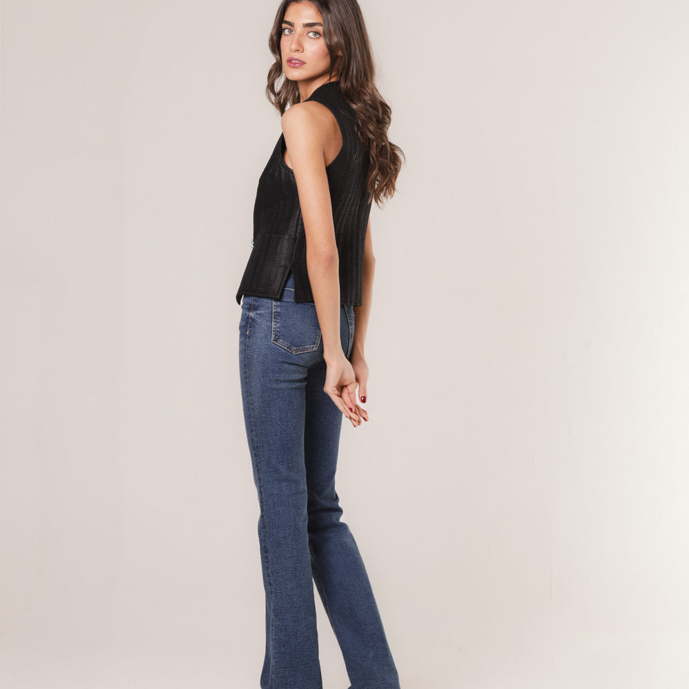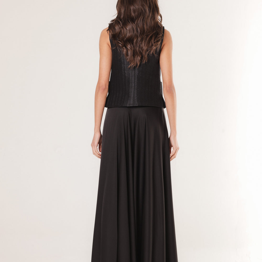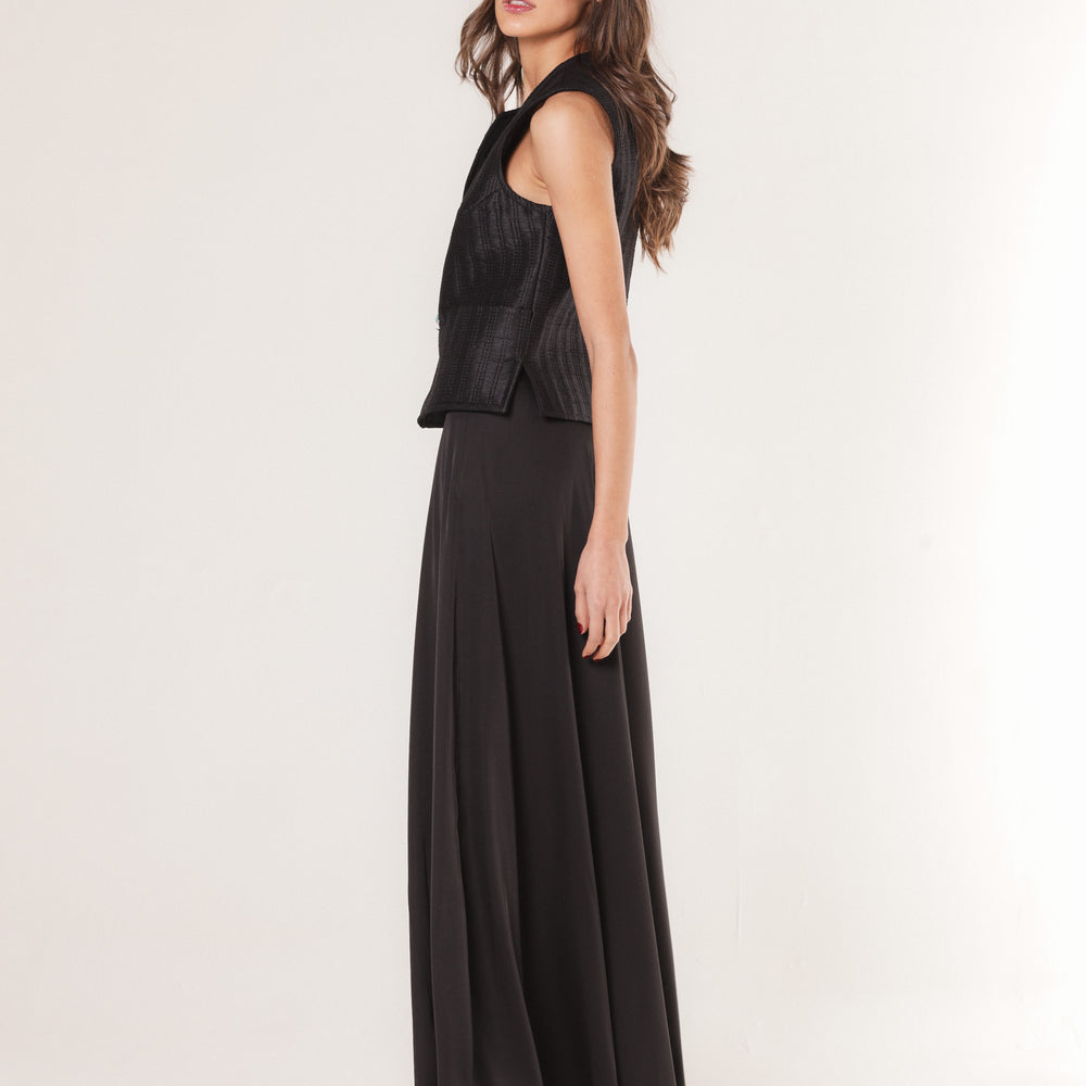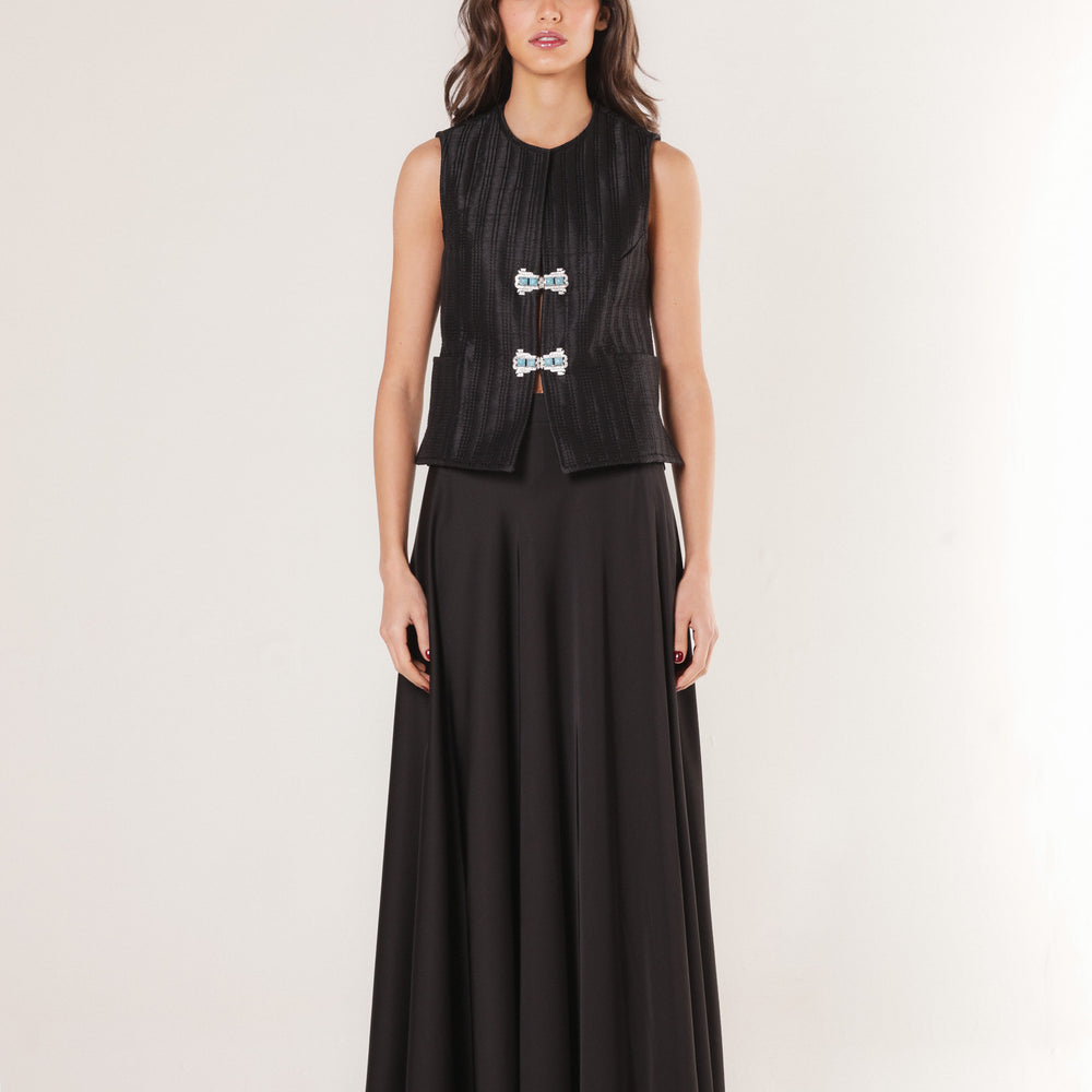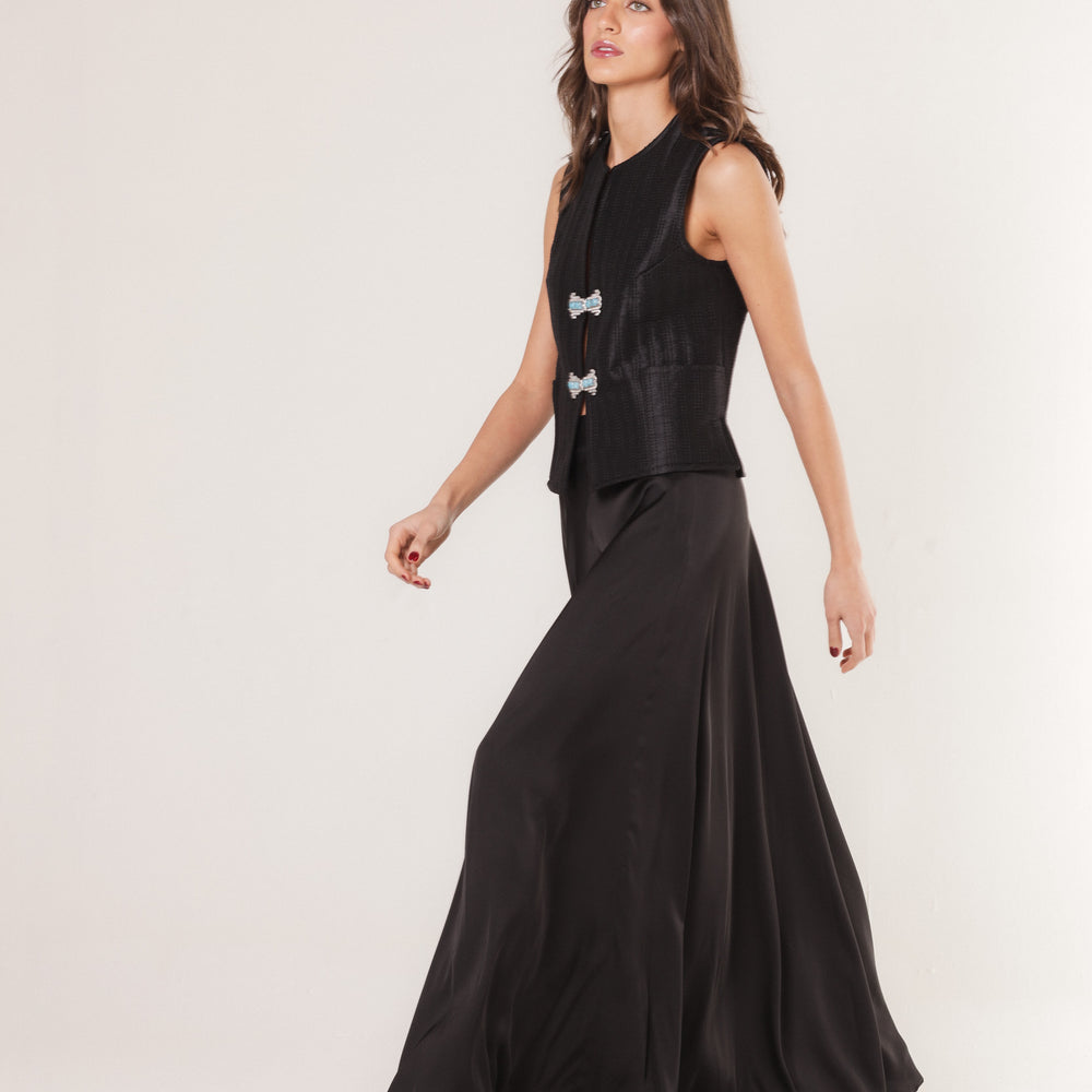 This exquisite vest weaves together traditional craftsmanship and contemporary elegance in a silhouette both sleek and timeless. Crafted in a deep black fabric with subtle texture, it offers a refined tailored structure while remaining effortlessly versatile thanks to its sleeveless cut. Perfect worn solo or layered.