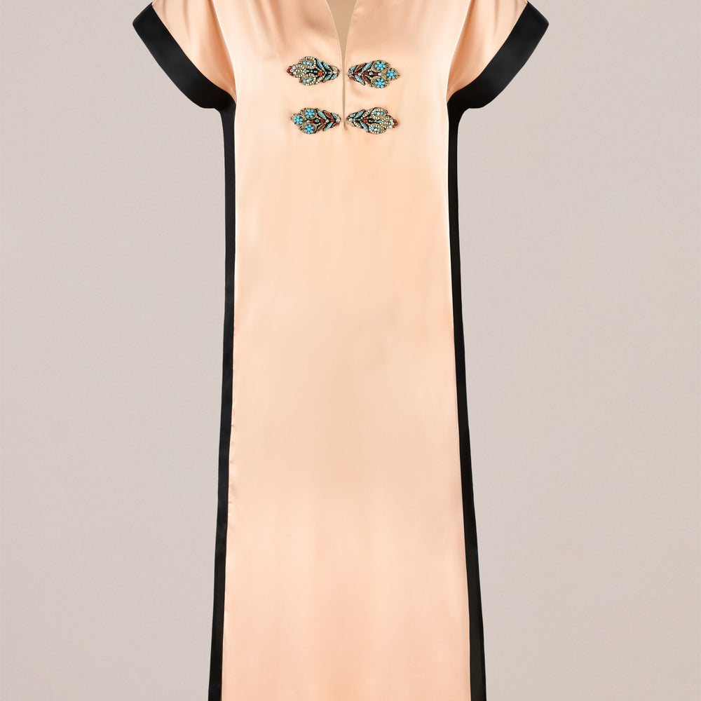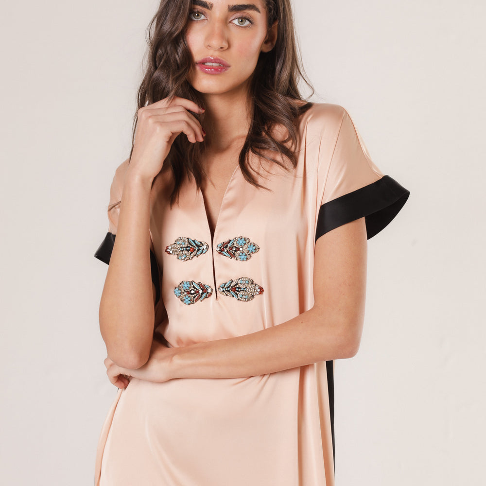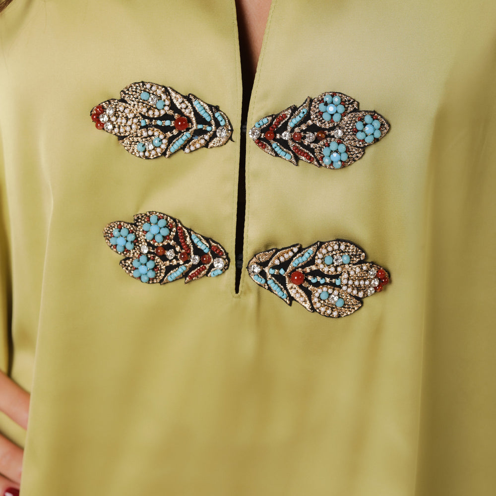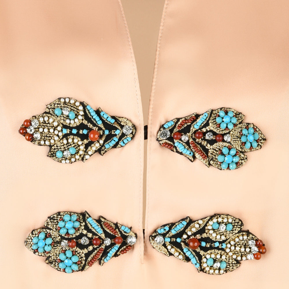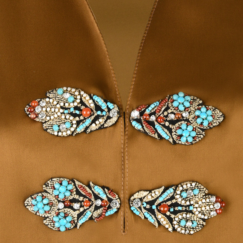 A timeless silhouette infused with the spirit of craftsmanship. This flowing piece features a deep V-neckline, designed to subtly accentuate femininity and elegance. At its heart, two pairs of ornate closures, handcrafted and adorned with turquoise beads, agate, mother-of-pearl, and Swarovski crystals. A delicate and precious composition that catches the light and draws the eye.
