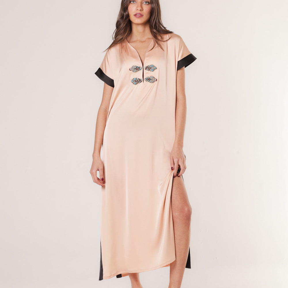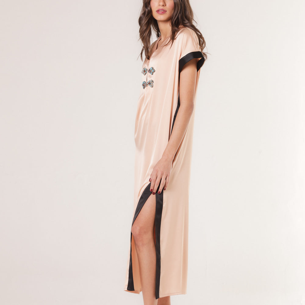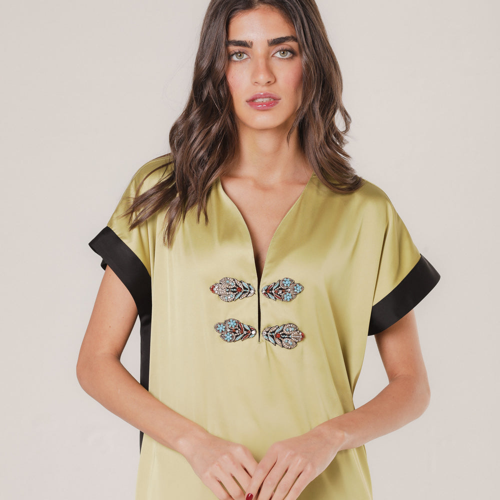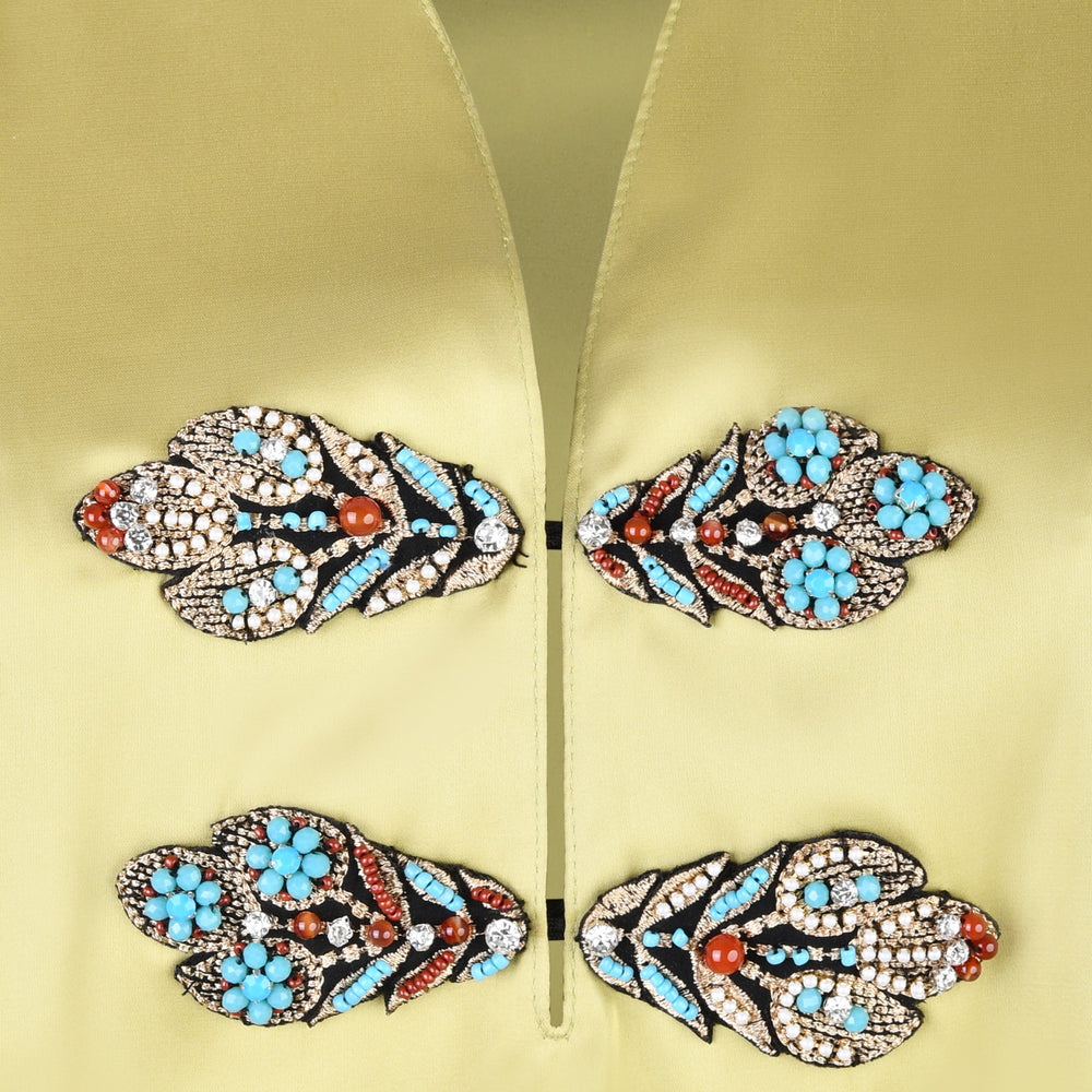A timeless silhouette infused with the spirit of craftsmanship. This flowing piece features a deep V-neckline, designed to subtly accentuate femininity and elegance. At its heart, two pairs of ornate closures, handcrafted and adorned with turquoise beads, agate, mother-of-pearl, and Swarovski crystals. A delicate and precious composition that catches the light and draws the eye.