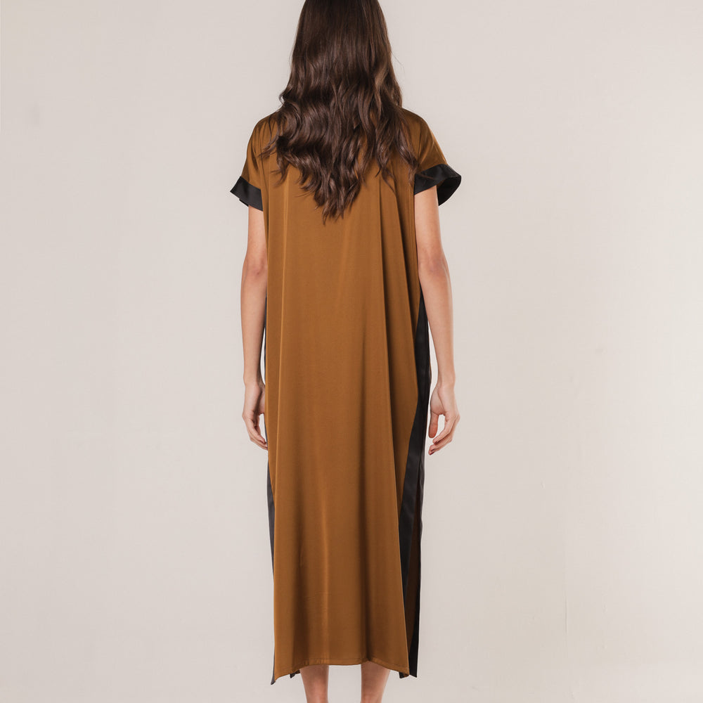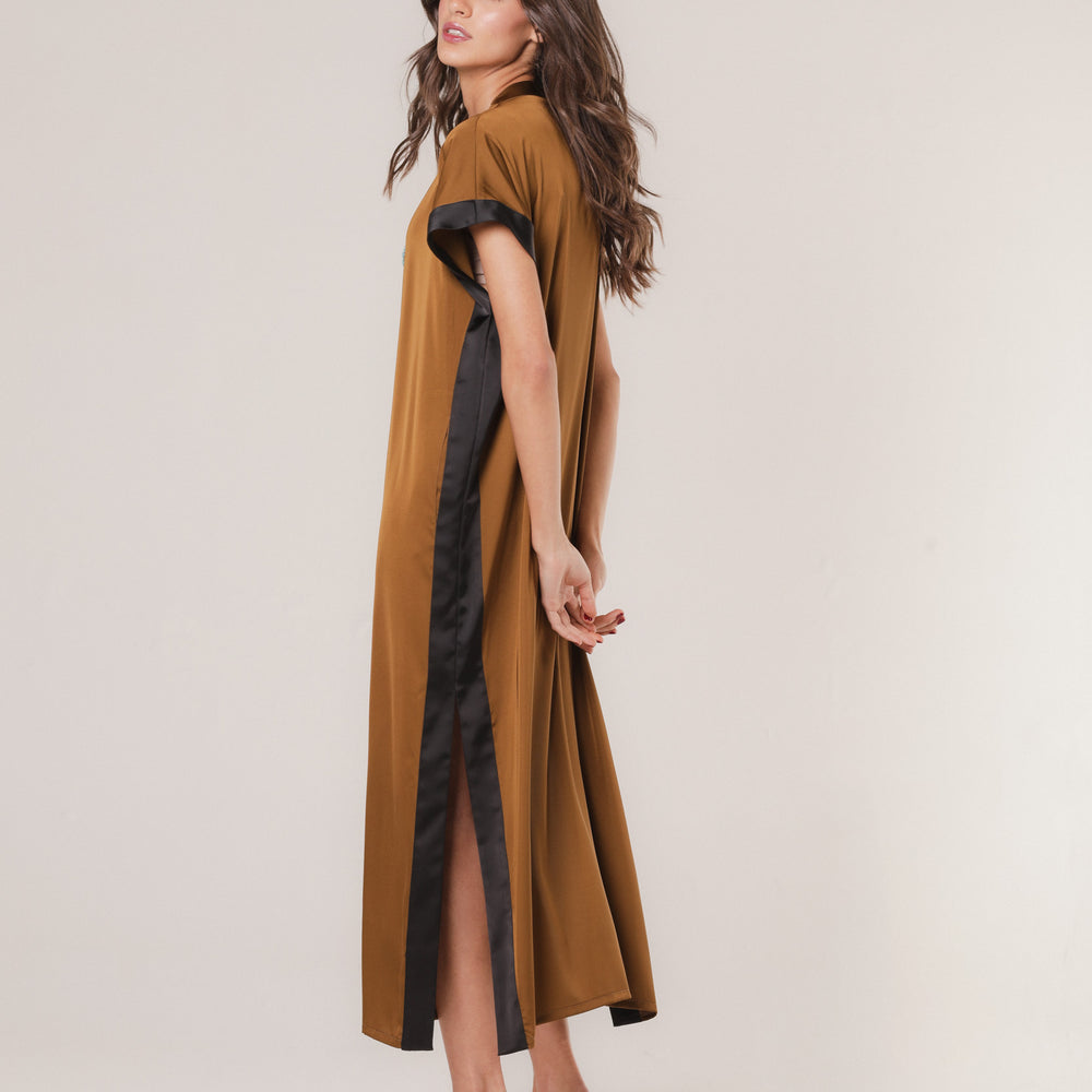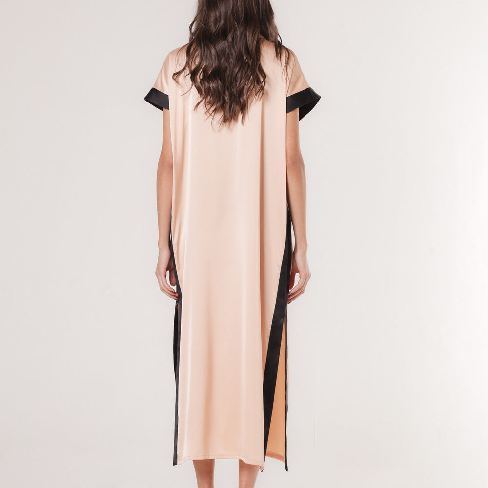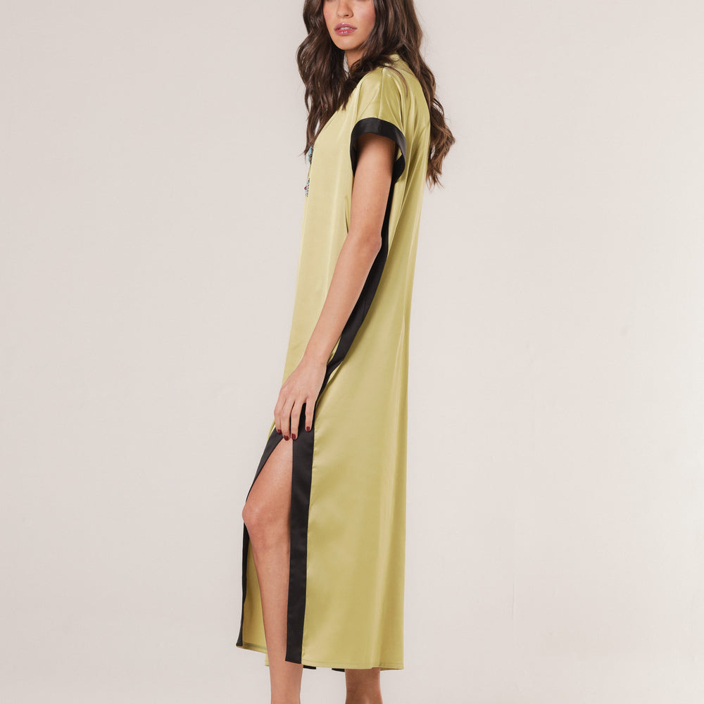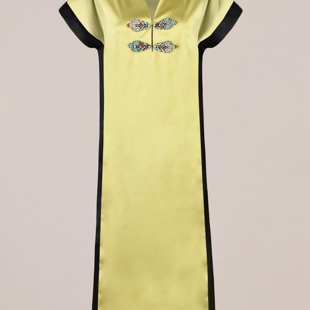 A timeless silhouette infused with the spirit of craftsmanship. This flowing piece features a deep V-neckline, designed to subtly accentuate femininity and elegance. At its heart, two pairs of ornate closures, handcrafted and adorned with turquoise beads, agate, mother-of-pearl, and Swarovski crystals. A delicate and precious composition that catches the light and draws the eye.