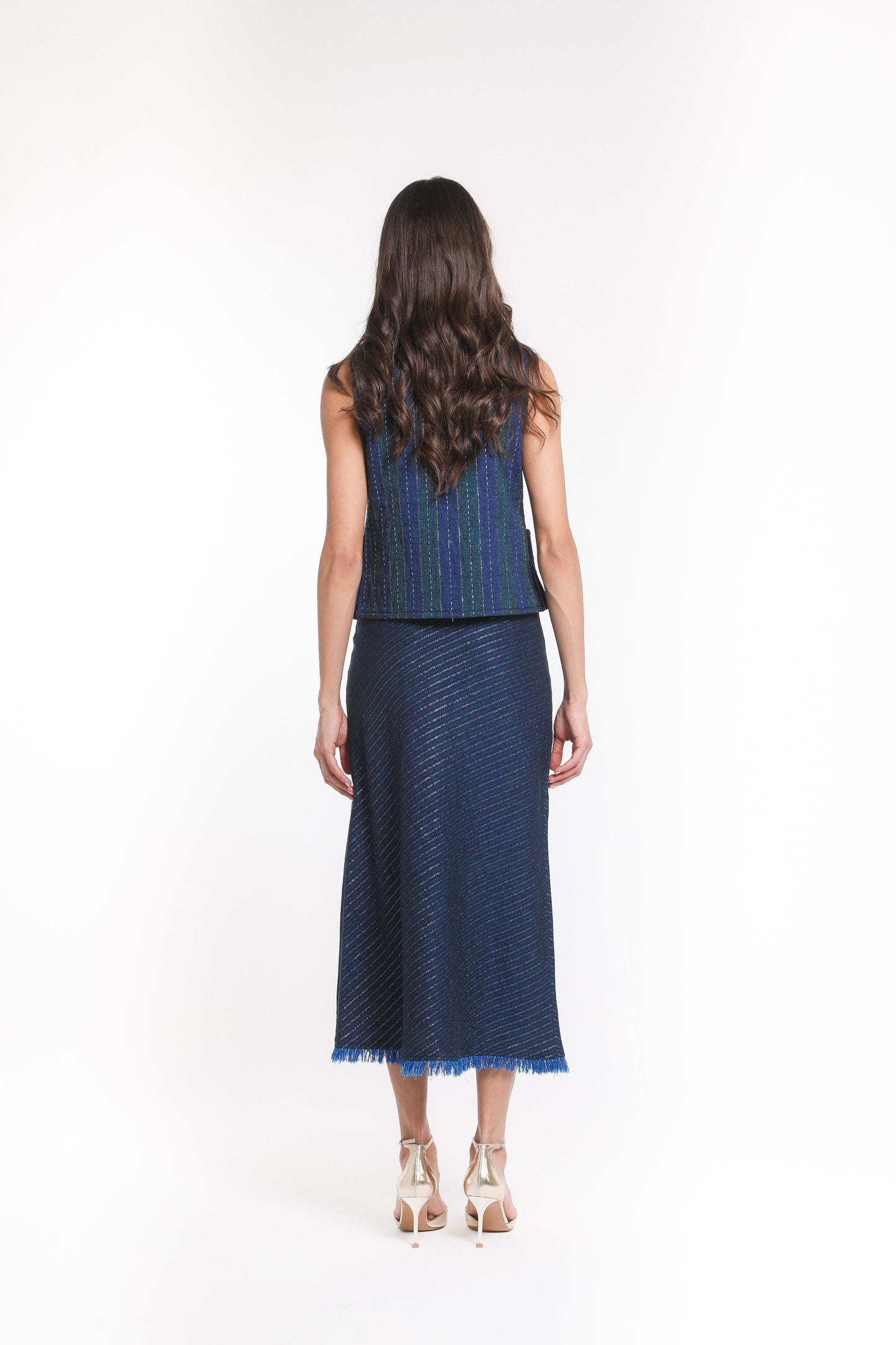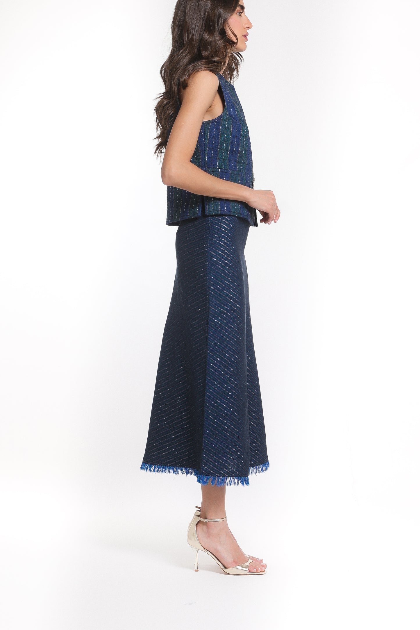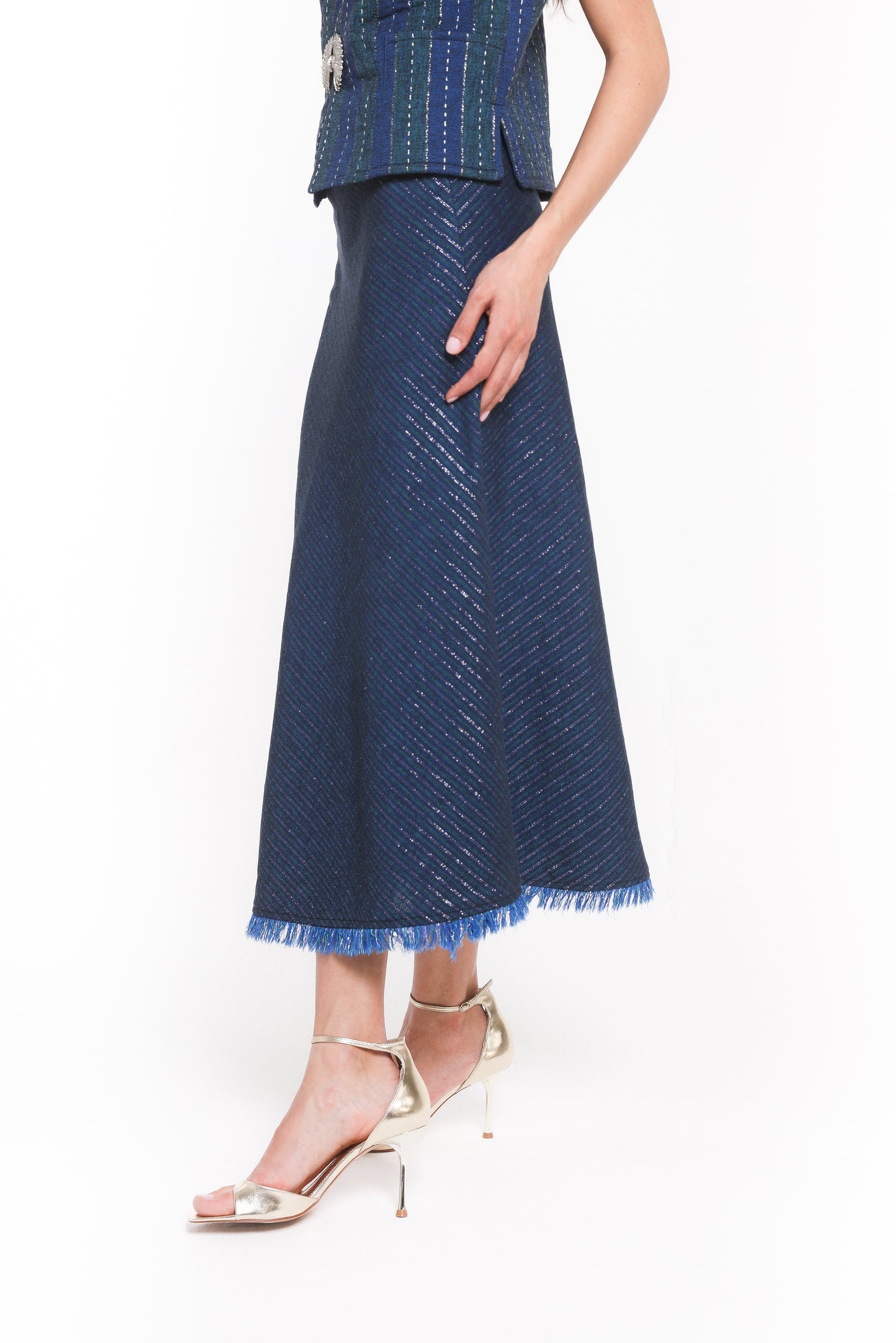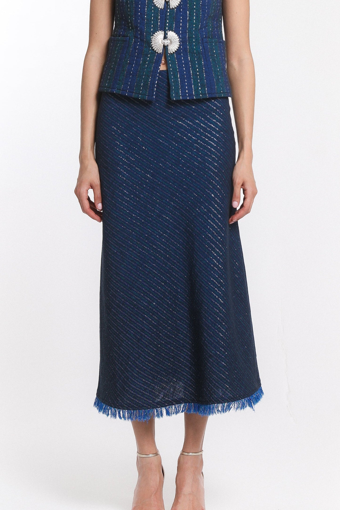 The Taj Skirt is an ode to elegance, crafted in Zar-Baft a Persian heritage textile woven with metallic threads, once reserved for the garments of nobles and kings. Its fluid A-line silhouette falls gracefully to a midi length, finished with a soft fringed hem that lends delicate movement to every step.