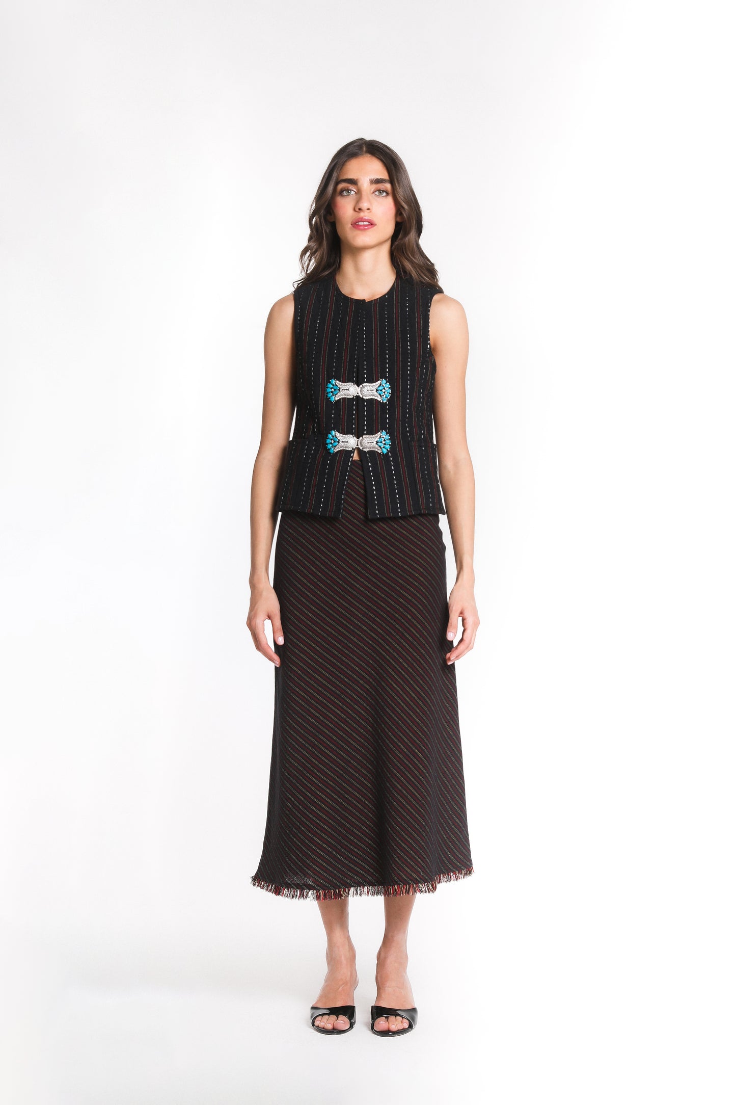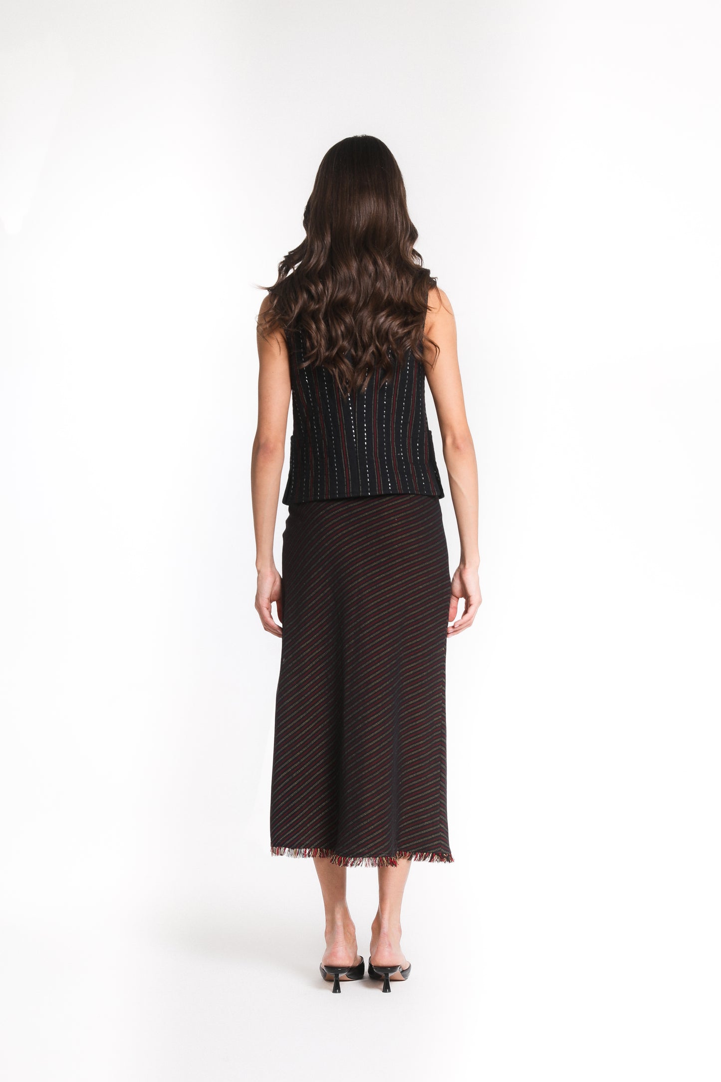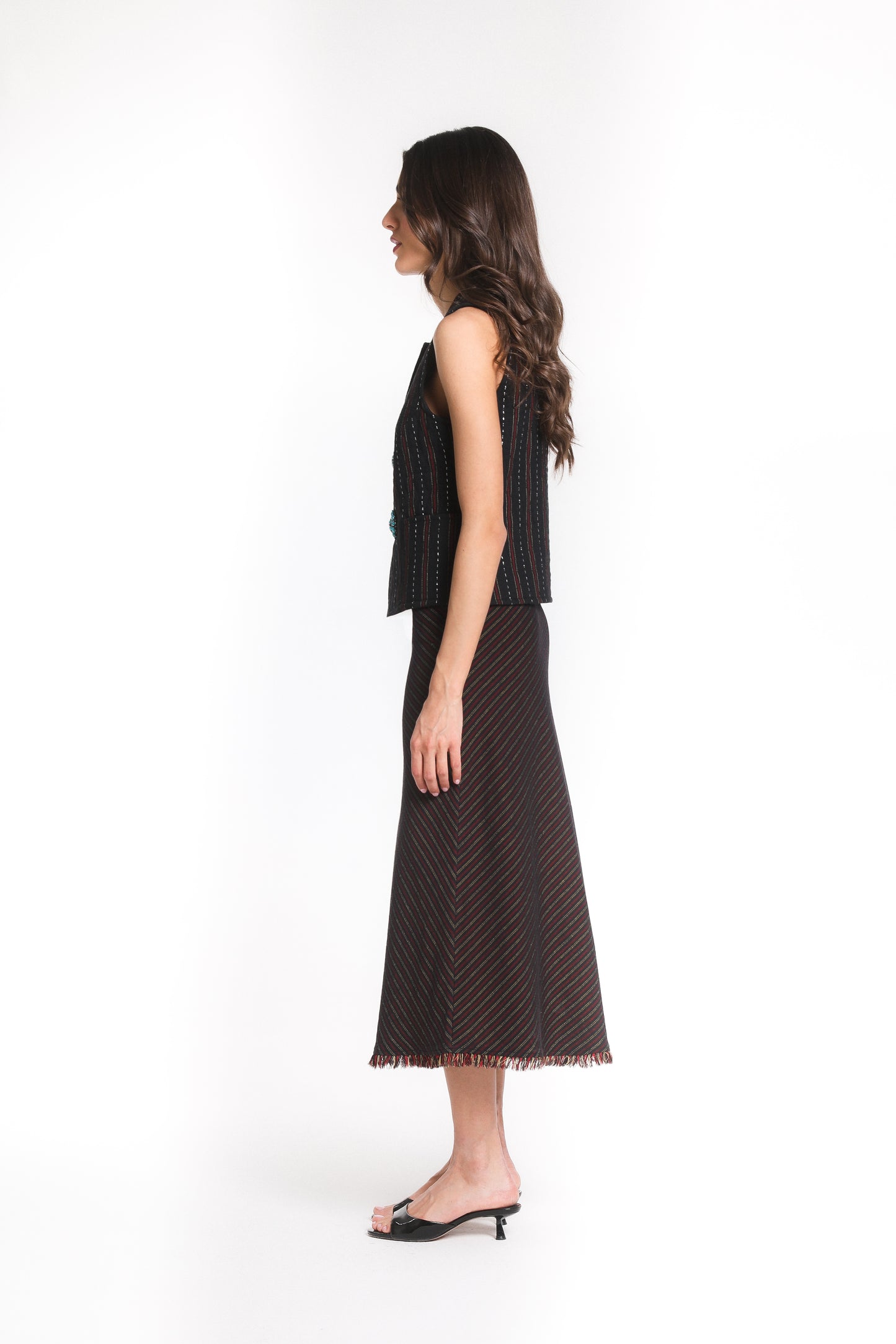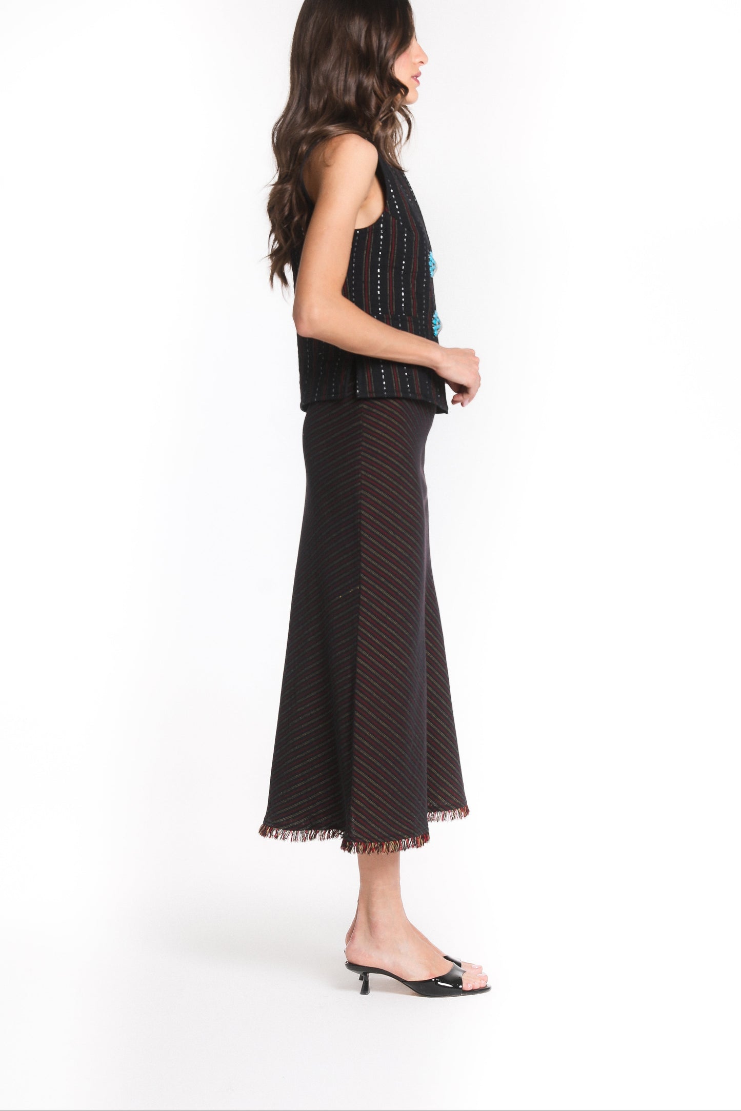 The Taj Skirt is an ode to elegance, crafted in Zar-Baft a Persian heritage textile woven with metallic threads, once reserved for the garments of nobles and kings. Its fluid A-line silhouette falls gracefully to a midi length, finished with a soft fringed hem that lends delicate movement to every step.