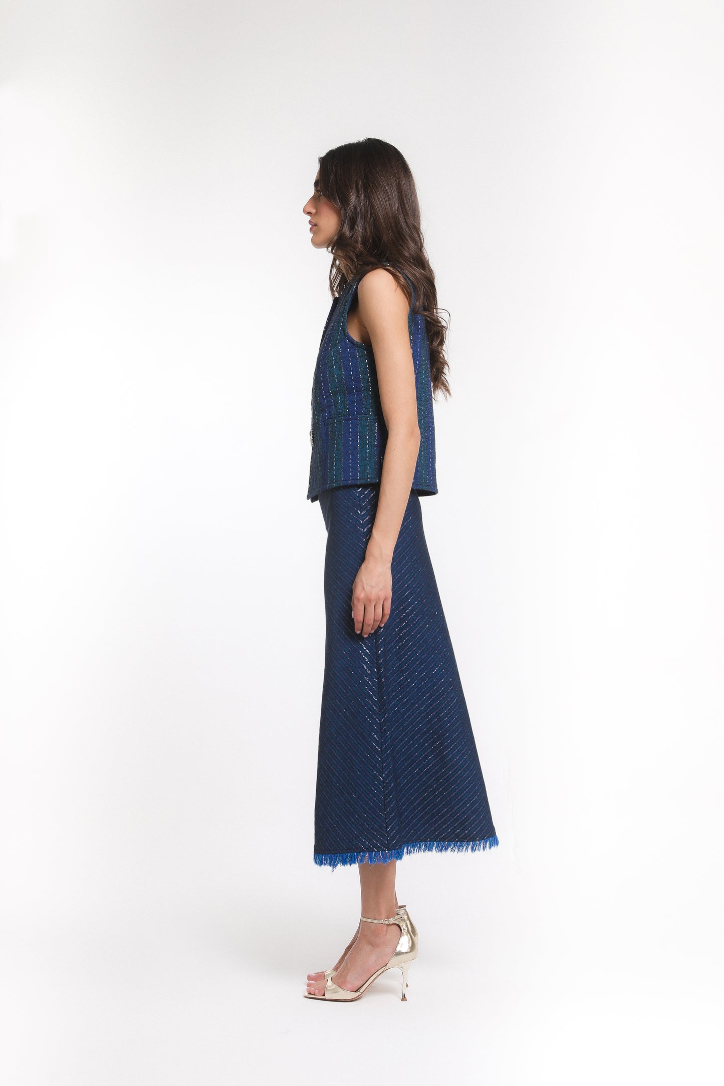 The Saphir Vest captures celestial elegance in deep sapphire blue with subtle green undertones and fine metallic stripes. Fully lined in silk for refined comfort, it is finished with radiant Swarovski crystal clasps that shimmer like stardust. A graceful balance of luxury and modern polish, this vest brings effortless sophistication to any look.